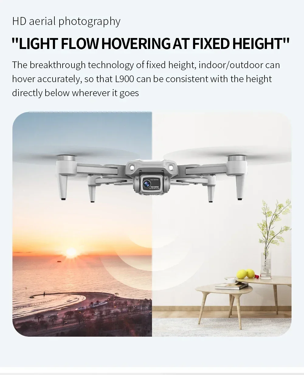 The breakthrough technology of fixed height, indoor/outdoor can hover accurately, so that L900 can be consistent with the height directly below wherever it goes.