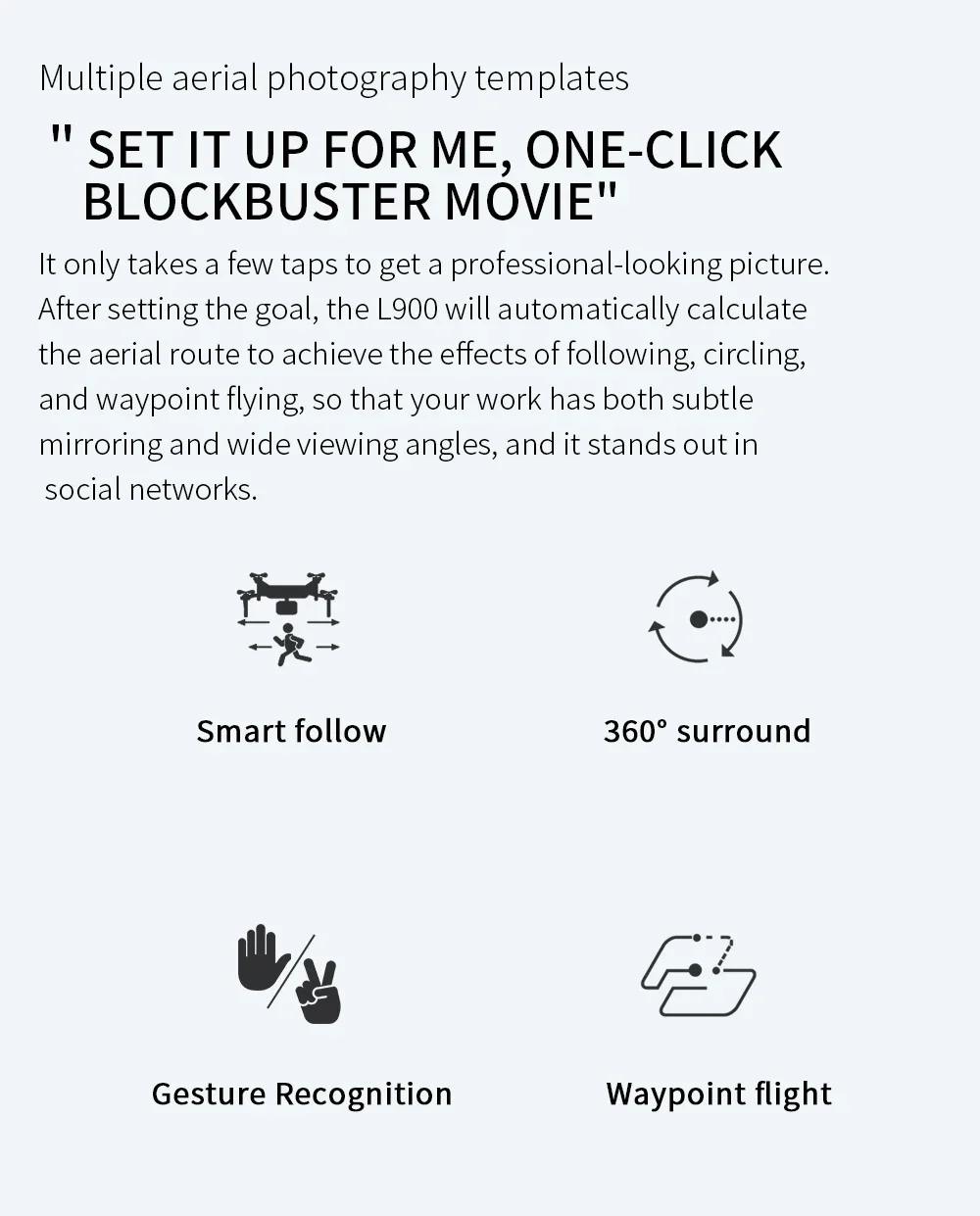 It only takes a few taps to get a professional looking picture. After setting the goal, the L900 will automatically calculate the aerial route to achieve the effects of fllowing, circling, and waypoint flying, so that your work has both subtle mirroring and wide viewing angles, and it stands out in social networks.