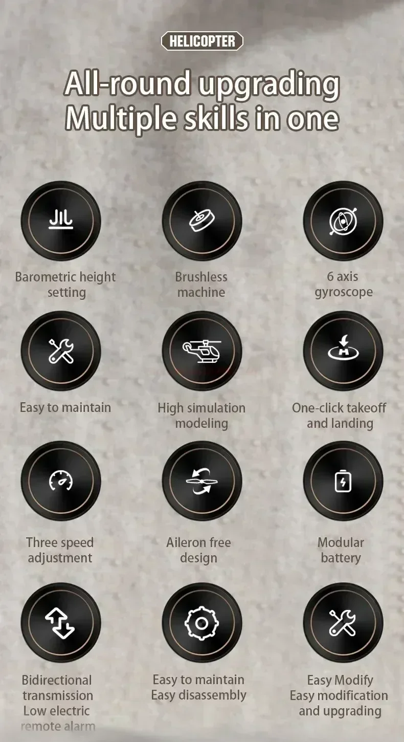 Adopting a single propeller without aileron design, a 6-axis electronic gyroscope for stability enhancement, and incorporating a barometer for altitude control. Optional optical flow positioning for more stable flight and easier control! Long battery life! Impact resistant! The appearance is reduced in proportion to the actual aircraft, which can not only control flight but also serve as a decoration