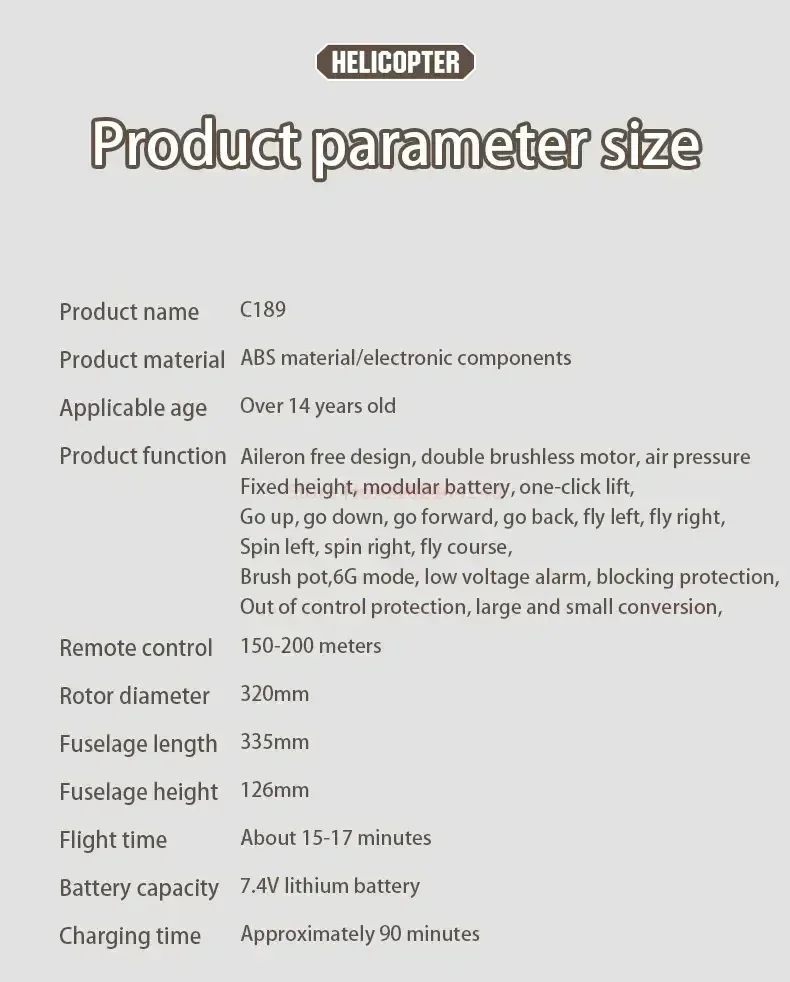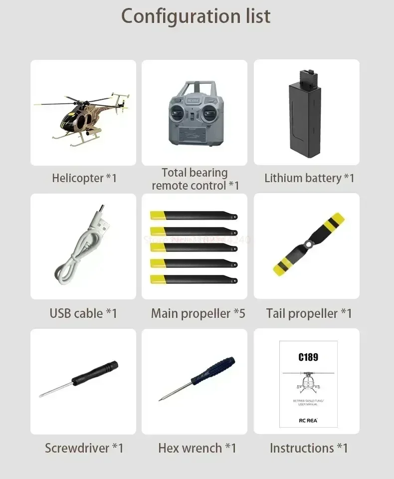 Product configuration: color box packaging * 1, helicopter * 1, main seat remote control * 1, manual * 1, USB charger * 1, main propeller * 5, tail propeller * 1, lithium battery * 1, screwdriver * 1, hexagonal wrench * 1