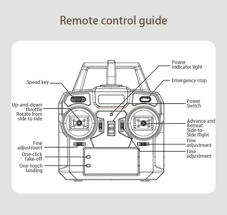 8. Low voltage alarm, locked rotor protection, loss of control protection, large and small rudder conversion, one click takeoff, one click landing, and other functions;