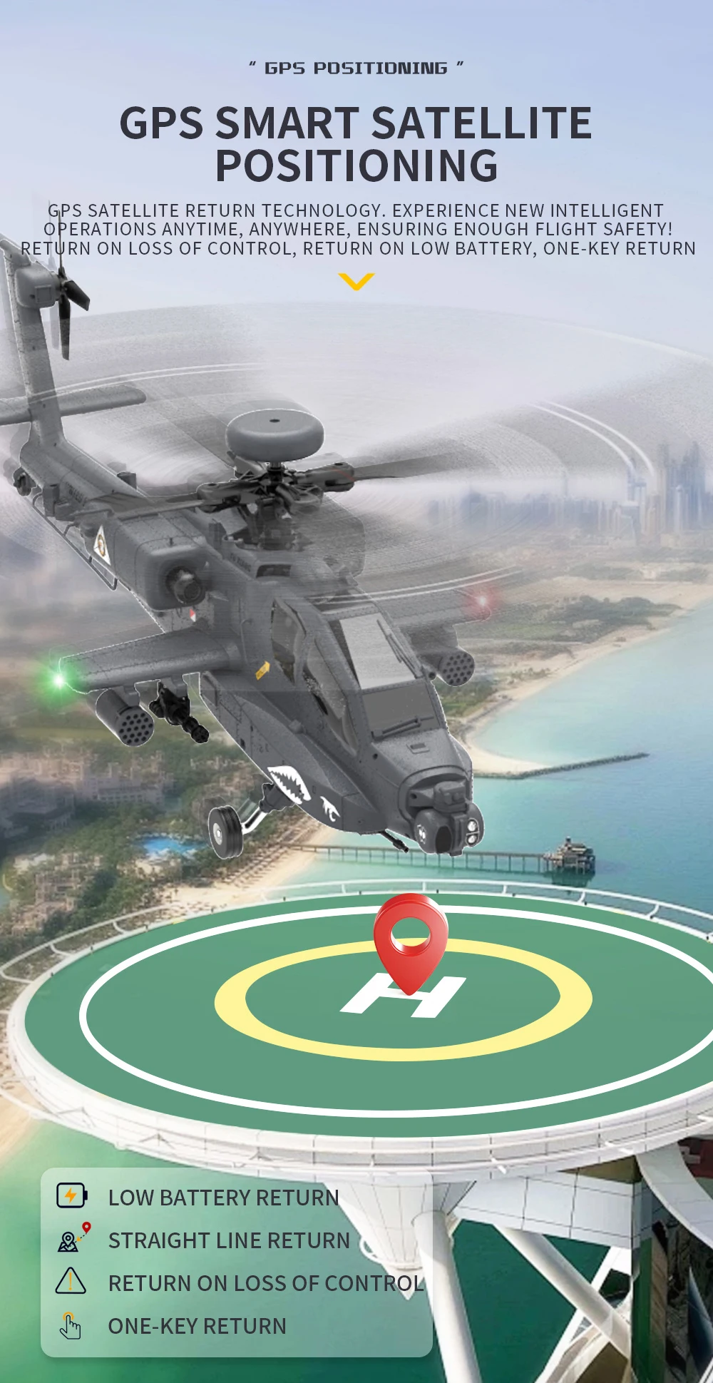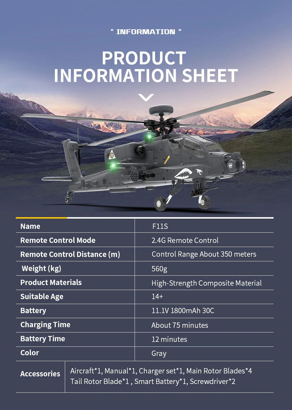 YuXiang F11S Apache AH-64 GPS Stabilized RC Helicopter,It features a no-aileron design with dual-axis coaxial drive motors for precise control. Includes smart flight control with GPS stabilization and barometric altitude hold. Utilizes laser radar and downward optical flow for stable and accurate altitude control. Equipped with 4.3g metal digital servos and a new 9-channel high-precision remote control.