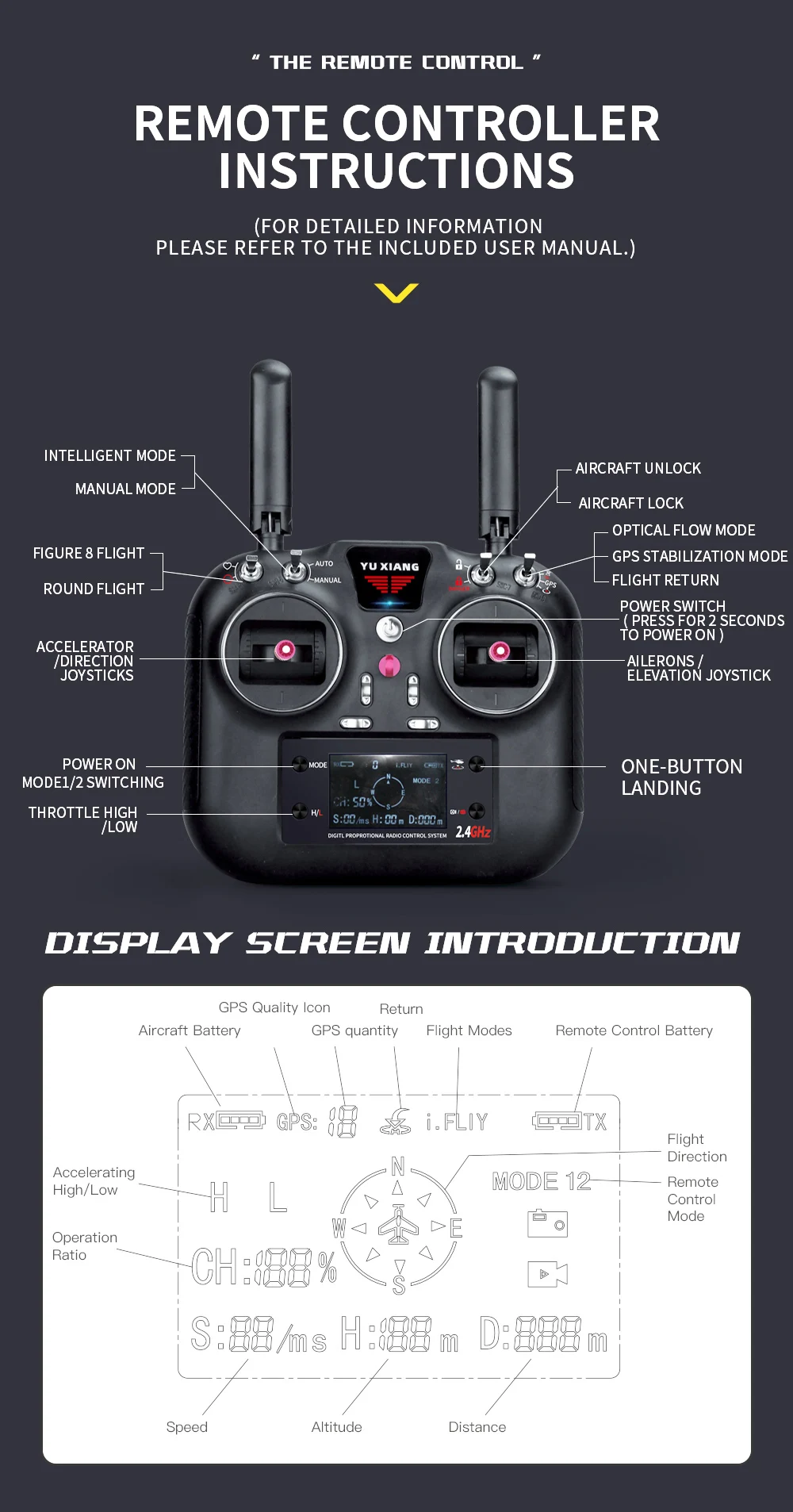 10. High-Precision Remote Control: New 9-channel high-precision remote control with 2.4GHz bidirectional communication protocol. Features 1024 levels of control sensitivity, a high-definition display, and bidirectional data transmission to provide real-time feedback on battery level, flight speed, altitude, distance, orientation, and GPS status for precise control.