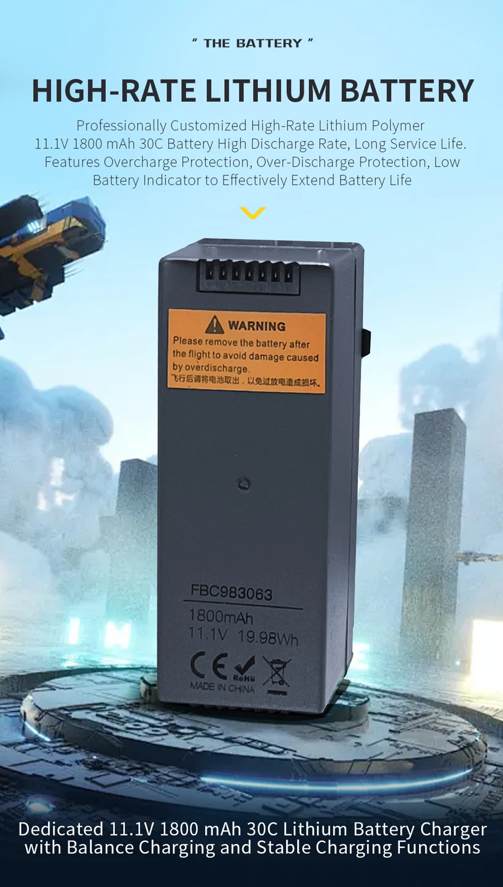 13. High-Performance Battery: Professionally customized high-discharge-rate Li-Po battery, 11.1V 1800mAh 30C, with high discharge rate and long lifespan. Flight time is approximately 10-12 minutes, with over 500 charge cycles under normal use. Features overcharge, over-discharge, and low battery indicators to effectively extend battery life.